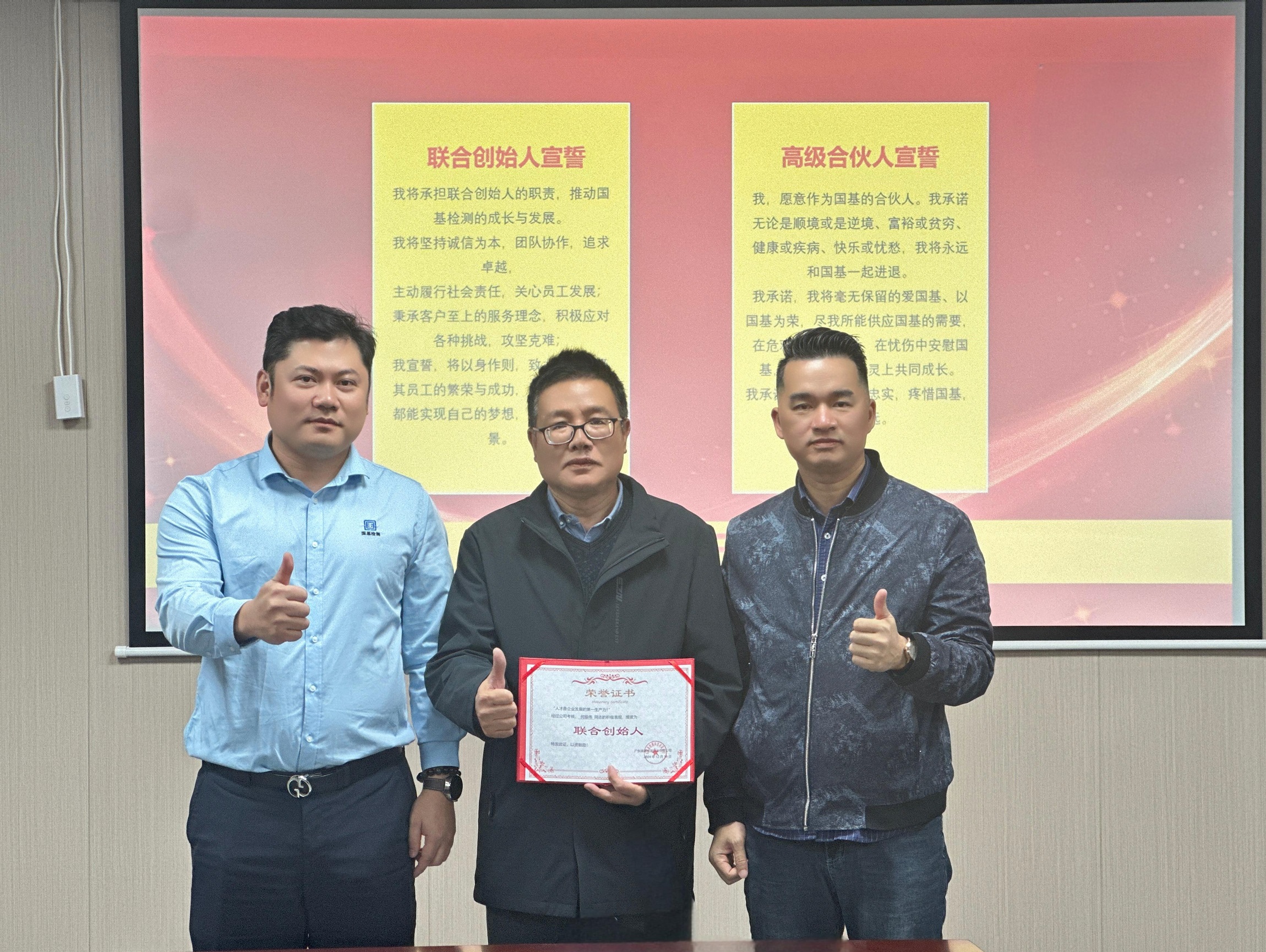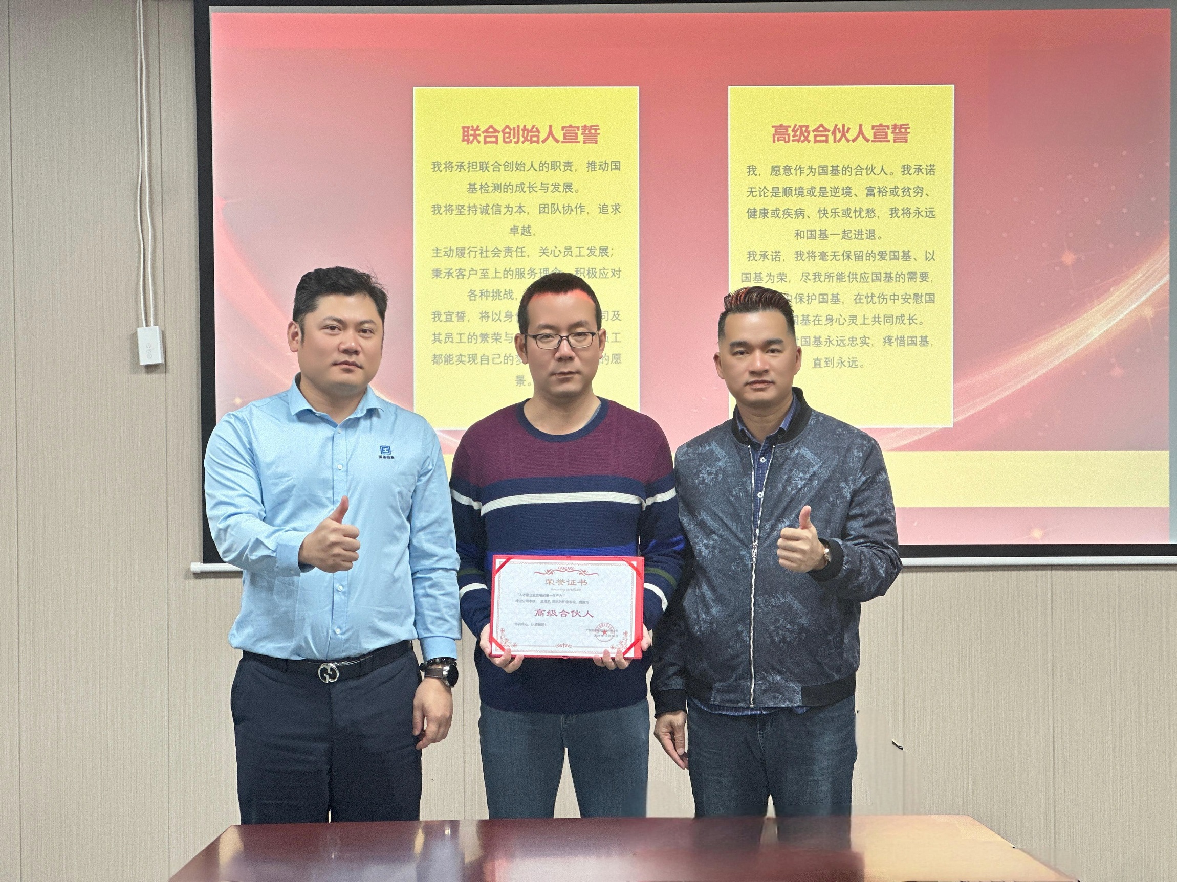 國基檢測聯(lián)合創(chuàng)始人&CEO楊穎惠表示經(jīng)過三個月的考核期,三位同事正式成為我們國基檢測合伙人團(tuán)隊(duì)的核心成員,希望大家能夠團(tuán)結(jié)友愛,共同建設(shè)國基檢測的未來。